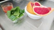 モズクが入っていた容器をきれいに洗って炒めるチンゲン菜を準備、寄せ豆腐の器にデザートの果物を