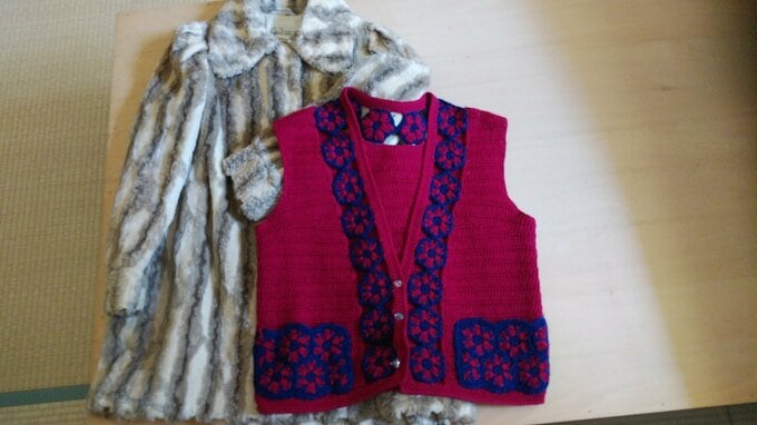 <左から>成人になる年に買ってもらったコートと、大学入学時に母に編んでもらったベスト