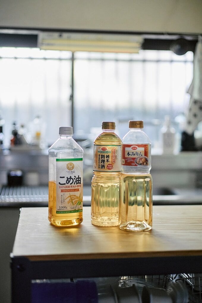 スーパーから持ち帰るときに、重たくないようビンではなくプラスチックボトルをチョイス。酒、みりんは「コープ」オリジナルを。油は酸化しにくいという米油に