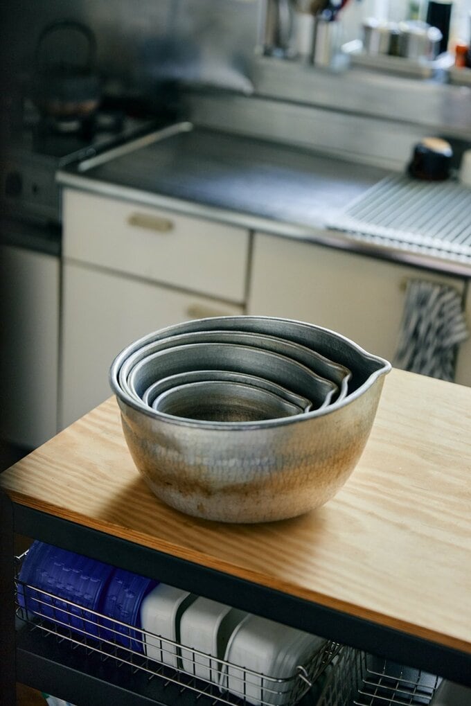 「有次」のやっとこ鍋。いちばん大きなサイズはタケノコなどをゆでるときに。小さなものは絹サヤなどをゆでて。入れ子式にしまえるので、場所を取りません
