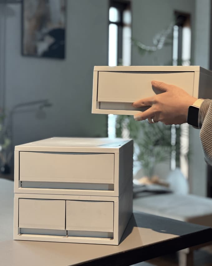 上/・ポリプロピレン小物収納ケース中 ホワイトグレー(¥1290)、下/・ポリプロピレン小物収納ケース中 引出2個 ホワイトグレー(¥1490)